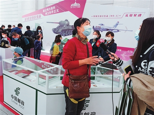 圖為北京郵政在中國人民革命軍事博物館設立的臨時郵局內,郵迷們積極選購郵品并接受媒體采訪。