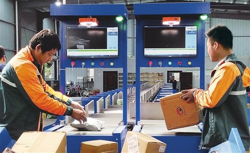 在“雙11”前,浙江省杭州市郵政分公司在4個經營部安裝了自動分揀機。當郵件到來后,員工在車廂尾部卸包裹,直接把包裹放在供包機上。包裹隨著皮帶機爬上分揀臺,負責分揀的員工將包裹面單朝上,分揀臺上的攝像頭一掃,包裹便根據掃描的信息落入相應的段道格口。經營部安裝了自動分揀機后,以前是25名員工1個小時分揀3000件郵件,現在6個人就能用1個小時分揀完3000件郵件,同時,作業現場一改往年包裹擺攤、員工無地下腳的場景。目前,有的經營部每日進口郵件量較平時增長75%,但有了自動分揀機,攬投員早晨出班時間可提前40分鐘。