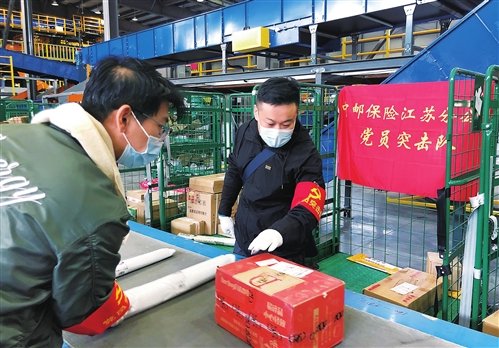 圖為中郵保險江蘇分公司黨員突擊隊忙碌在郵件裝運現場。