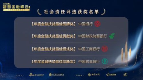 12月11日,“2020中國銀行業發展論壇智慧金融(北京)峰會暨第八屆銀行綜合評選頒獎典禮”召開。中國郵政儲蓄銀行獲“年度金融扶貧最佳貢獻獎”。