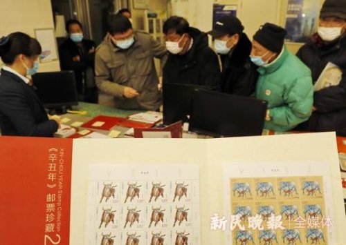 圖為在中國郵政上海金山區石化郵政支局營業大廳,集郵愛好者在排隊購買《辛丑年》特種郵票