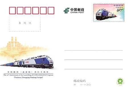 3月19日,中國郵政將發行今年首套紀念郵資片——JP259《中歐班列(渝新歐)開行十周年》紀念郵資明信片,全套一枚,面值80分,預計郵局售價1.20元。