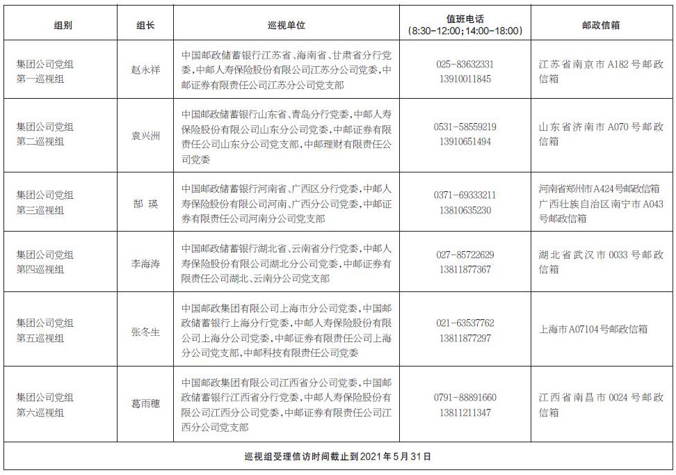 根據集團公司黨組部署,黨組巡視組將在被巡視單位開展為期兩個月左右的巡視。巡視期間設專門值班電話和專門郵政信箱,主要受理反映被巡視單位領導班子及其成員、下一級黨組織領導班子主要負責人和重要崗位領導干部問題的來信來電,重點是關于違反政治紀律、組織紀律、廉潔紀律、群眾紀律、工作紀律和生活紀律等方面的舉報和反映。巡視組受理信訪時間截止到2021年5月31日。