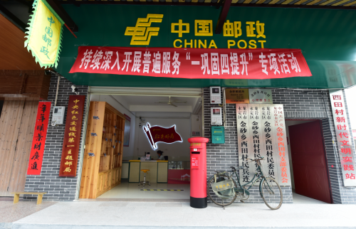 剛一走進(jìn)離伯公凹不遠(yuǎn)的金砂紅色小鎮(zhèn),就能感受到濃烈的紅色文化氛圍——街道兩邊高高掛著紅旗,建筑上隨處可見(jiàn)五角紅星。“中央紅色交通線”第一主題郵局就位于小鎮(zhèn)的中心位置,主題郵局門(mén)口有一個(gè)格外顯眼的紅色郵筒。