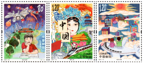 《兒童畫作品選》特種郵票一套3枚,分別為《我的中國夢》《國粹之韻》《希望與夢想》?!段业闹袊鴫簟吠ㄟ^描繪我國航空航天事業(yè)、城市、交通網(wǎng)絡(luò)繁榮發(fā)展等場景,表達了少年兒童不斷追尋對宇宙探索的夢想以及對未來美好生活的想象與憧憬;《國粹之韻》描繪了傳統(tǒng)文化與城市發(fā)展、現(xiàn)代科技共繁榮的場景,表達了新時代的少年兒童對中華優(yōu)秀傳統(tǒng)文化的追求和傳承;《希望與夢想》描繪了偉大祖國不斷發(fā)展的場景,少年兒童登高望遠、憧憬未來。三枚郵票緊密圍繞主題,展現(xiàn)出少年兒童對黨的領(lǐng)導(dǎo)下偉大祖國的美好祝愿、熱愛和自豪。其中,《國粹之韻》由合肥新站壽春實驗中學(xué)的費玉婷同學(xué)設(shè)計。