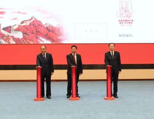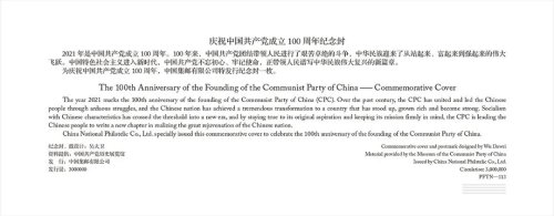 2021年6月29日,《中國共產(chǎn)黨成立100周年》紀念郵票和紀念封在中國共產(chǎn)黨歷史展覽館隆重發(fā)布。中共中央宣傳部副部長蔣建國,國家郵政局黨組書記、局長馬軍勝,中國郵政集團有限公司黨組書記、董事長劉愛力出席發(fā)布儀式并為《中國共產(chǎn)黨成立100周年》紀念郵票揭幕,國家郵政局黨組成員、副局長戴應軍,中國共產(chǎn)黨歷史展覽館館長吳向東,中國郵政集團有限公司黨組成員、副總經(jīng)理康寧為《慶祝中國共產(chǎn)黨成立100周年》紀念封揭幕。中國郵政集團有限公司黨組成員、副總經(jīng)理王儉主持。