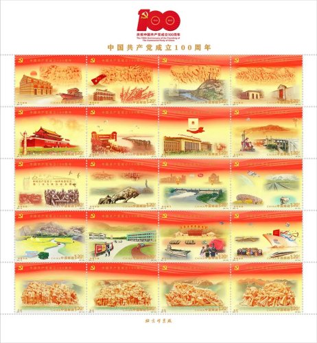 按照中國共產(chǎn)黨成立100周年慶祝活動安排,經(jīng)報請黨中央批準,中國郵政將于2021年7月1日發(fā)行《中國共產(chǎn)黨成立100周年》紀念郵票1套20枚,紀念封1套1枚。此次活動發(fā)布了紀念郵票的詳細信息,內容分別為:1.開天辟地;2.崢嶸歲月;3.中流砥柱;4.偉大勝利;5.開國大典;6.抗美援朝;7.制度奠基;8.自力更生;9.改革春潮;10.對外開放;11.世紀騰飛;12.科學發(fā)展;13.擺脫貧困;14.全面小康;15.強軍興軍;16.揚帆遠航;17.信仰;18.偉業(yè);19.攻堅;20.追夢。郵票采用連票設計形式,以紅色、金色為畫面主基調,運用油畫寫實手法表現(xiàn),并采用連綿不斷的飄帶貫穿整體,寓意中國共產(chǎn)黨百年奮斗的光輝歷程。該套郵票特別使用兩色紅熒光油墨,在紫光燈下,慶祝建黨百年標識、“一大會址”、“天安門”等郵票主體元素閃放璀璨的光芒。
