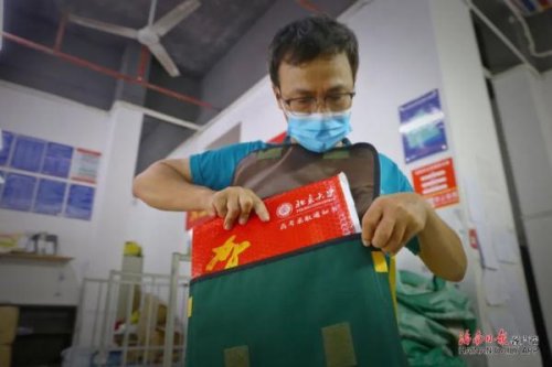 “老盧,你兒子的錄取通知書到了,今天就派你去投遞了。快過來登記下,你可要請客呀!”25日上午8點不到,在中國郵政集團有限公司海口市分公司振興營攬投站,工作人員從今天上午6點運達的快件中,分揀出一袋高考錄取通知書。打開袋子,“眼尖”的站長李世杰一眼就看出其中一個快件來自北大招生辦,收件人正是盧志強的兒子盧海山,就趕緊招呼“老盧”去投遞。
