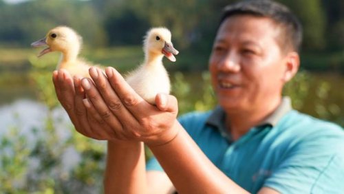 9月28日,雙峰郵政所的郵遞員吳文清在雙峰鎮的一家養殖基地幫一名村民選購鴨幼崽。