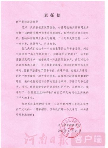 這位被表揚的投遞員名叫高祥,是西平縣郵政分公司攬投部的一名投遞員,在投遞崗位上勤勤懇懇的工作了31年,也是資歷最老的投遞員了。他每日從攬投部要跑40多分鐘才能到達投遞段道,服務(wù)區(qū)域主要集中在老王坡農(nóng)場等,投遞里程超57公里。