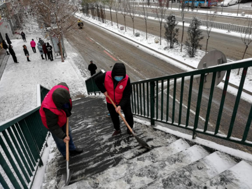 清雪過程中,志愿者們不懼嚴(yán)寒、揮動(dòng)掃把、拿起鐵鍬,在街路、天橋、小區(qū)、廣場(chǎng)等地除雪除冰。雖然室外天寒地凍,但他們熱情高漲、干勁不減,用實(shí)際行動(dòng)踐行著為民服務(wù)的熾熱情懷。同時(shí),廣大志愿服務(wù)團(tuán)隊(duì)還廣泛宣傳、動(dòng)員市民積極行動(dòng)起來(lái),將自家周邊的積雪清理干凈,并勸導(dǎo)老人、兒童暴雪天氣非必要減少外出,讓市民群眾切實(shí)感受到志愿服務(wù)的溫暖。