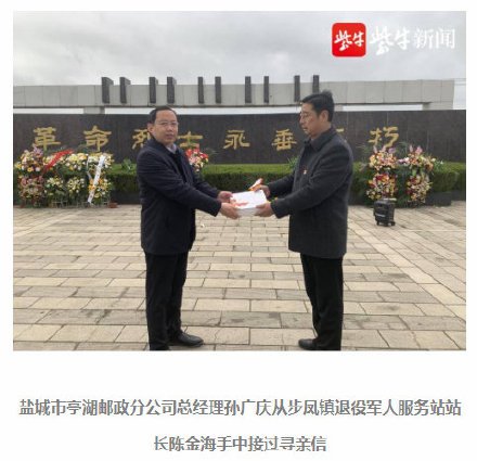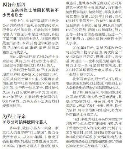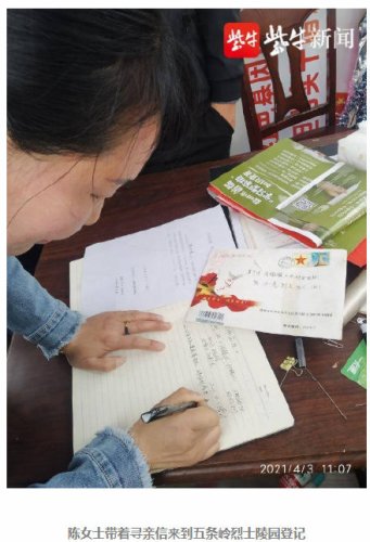 “爺爺,70多年了,我們終于找到您了!”4月3日,江蘇省鹽城市阜寧溝墩三合村陳必虎烈士的侄孫女陳女士來到五條嶺烈士陵園內(nèi)祭掃,她拿著收到的尋親信痛哭不已,她說終于圓了一家?guī)状恕?4年的尋親夢。五條嶺烈士陵園長眠著不少無名烈士,3批為烈士尋親活動共發(fā)出765封為烈士尋親信,已通過尋親信找到331名烈士親人。