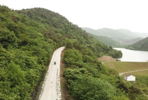 在安徽省巢湖市散兵鎮(zhèn)山區(qū)里,鄭愛軍騎行在投遞郵件的路上(4月30日無人機拍攝)。