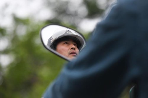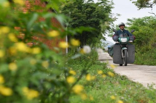 在安徽省巢湖市散兵鎮(zhèn)山口村,鄭愛軍騎行在投遞郵件的路上(4月30日攝)。