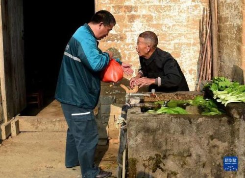 10月28日,在太湖縣北中鎮(zhèn)桐山村,吳義陽將代購的糯米送到老人手中。