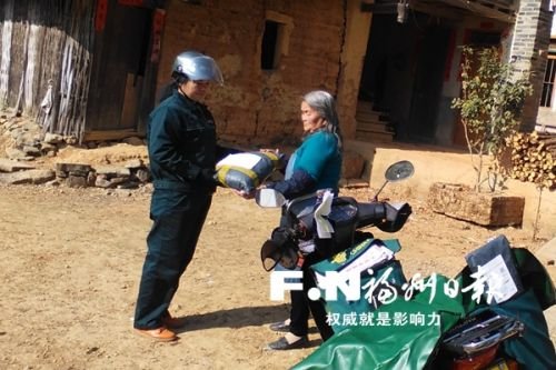 閩清縣上蓮鄉的高山上,一座簡陋的土墻瓦房前駛來一輛摩托車,身穿綠色工服的女郵遞員支好車,將一個包裹遞給住在這里的一位老奶奶。包裹里,是老奶奶的晚輩為她網購的日用品。