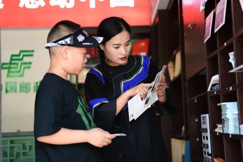 60平方米的主題郵局,擺放著各類主題郵品,游客的增多,讓負責人麻秀珍有點忙不過來了。“現在是暑期,很多學生和小朋友都會來這里參觀游玩,我會主動給他們介紹明信片和郵品上關于十八洞村的故事,很多人都對這些感興趣,會買一份紀念郵品帶回去給自己的同學、朋友,很有紀念意義。”她說。一位小朋友站在柜臺前對比了幾款明信片后,選擇了一套《苗鄉十八洞》的明信片,還讓麻秀珍給他的每一張明信片都蓋上郵戳。