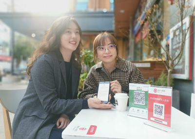 客戶(左)在郵儲銀行深圳分行數(shù)字人民幣試點(diǎn)商戶(右)的指導(dǎo)下體驗(yàn)數(shù)字人民幣消費(fèi)。