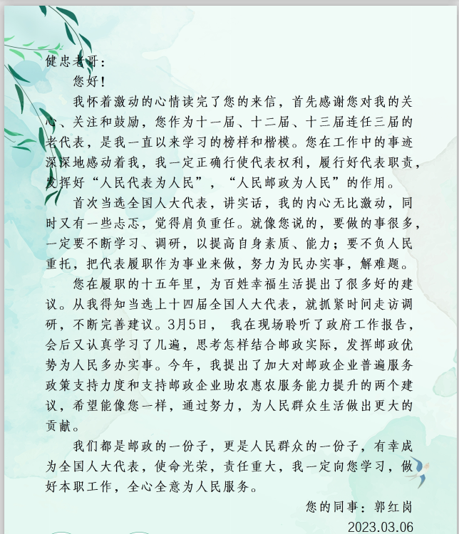 當晚,何健忠懷著一名老代表的責任感,拿出紙筆在案頭奮筆疾書,用傳統的書信形式、也代表著郵政人的儀式感,給兩位郵政系統新當選的全國人大代表郭紅崗、莫富元送上了殷殷寄語。