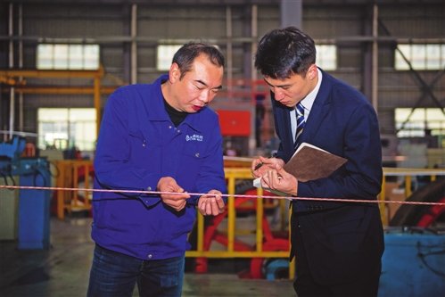 福建省分行客戶經理(右)走訪小微企業、了解生產情況。