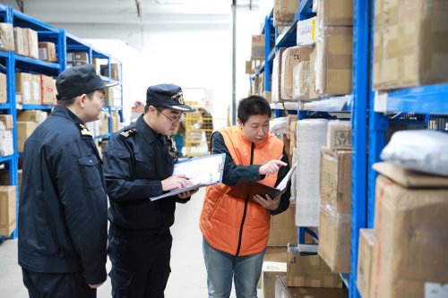 天津郵局海關(guān)關(guān)員在國際郵件監(jiān)管場地進(jìn)行巡檢(央廣網(wǎng)發(fā) 天津郵局海關(guān)供圖)