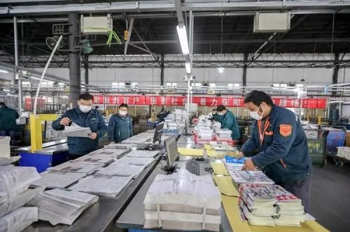 在位于滬太路的報刊處理場地,郵政工作人員將試點地鐵運快遞業務的報刊雜志用統一郵袋封裝后,運輸至延長路地鐵站 許雨舟 攝(下同)