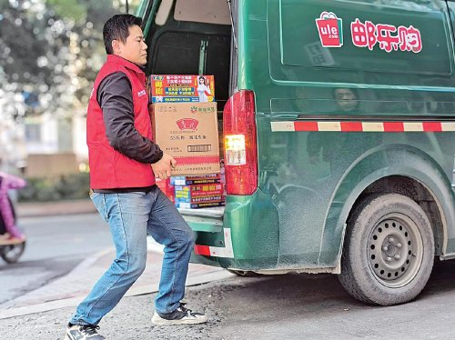 浙江省紹興市郵政分公司專(zhuān)職地推人員孫明在配送“年貨節(jié)”產(chǎn)品?! 踵嵥嫁薄z