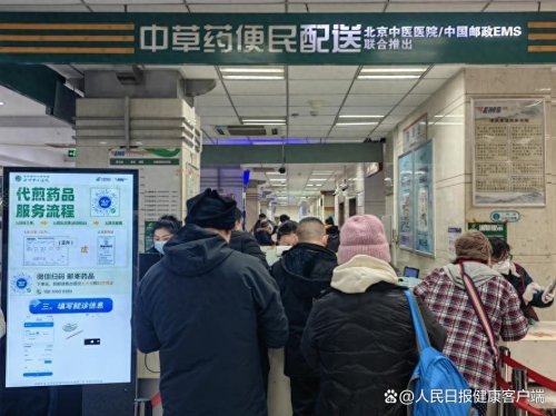 1月18日,人民日報健康客戶端記者來到首都醫(yī)科大學附屬北京中醫(yī)醫(yī)院,只見不少看完診的患者拿著藥方和票據(jù)來到中草藥便民配送柜臺前,在工作人員的指引下掃碼下單,一旁的中國郵政工作人員認真地打包著需要郵寄的中草藥,不一會兒裝箱好的待寄藥品就壘滿了手推車。