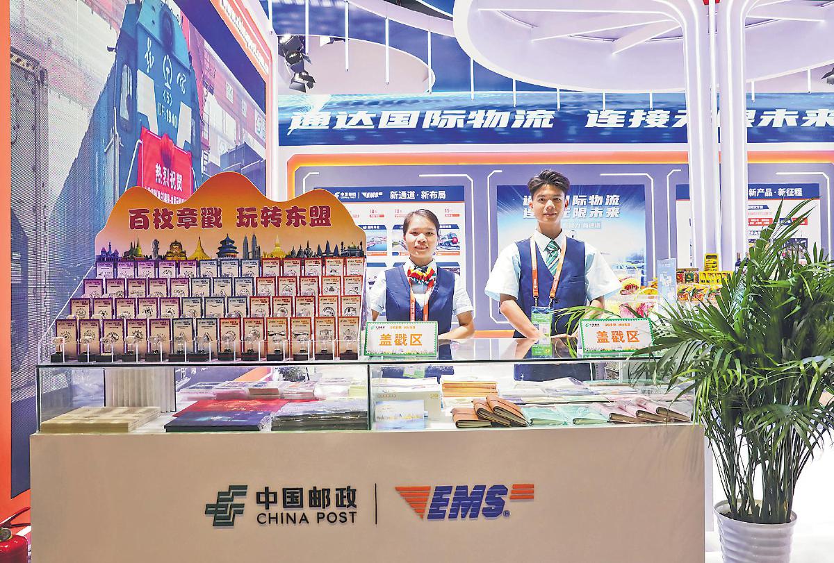 廣西郵政在第20屆中國—東盟博覽會上設(shè)置“百枚郵戳 玩轉(zhuǎn)東博”活動專區(qū),供觀眾打卡、集戳。 □莫樹森 攝