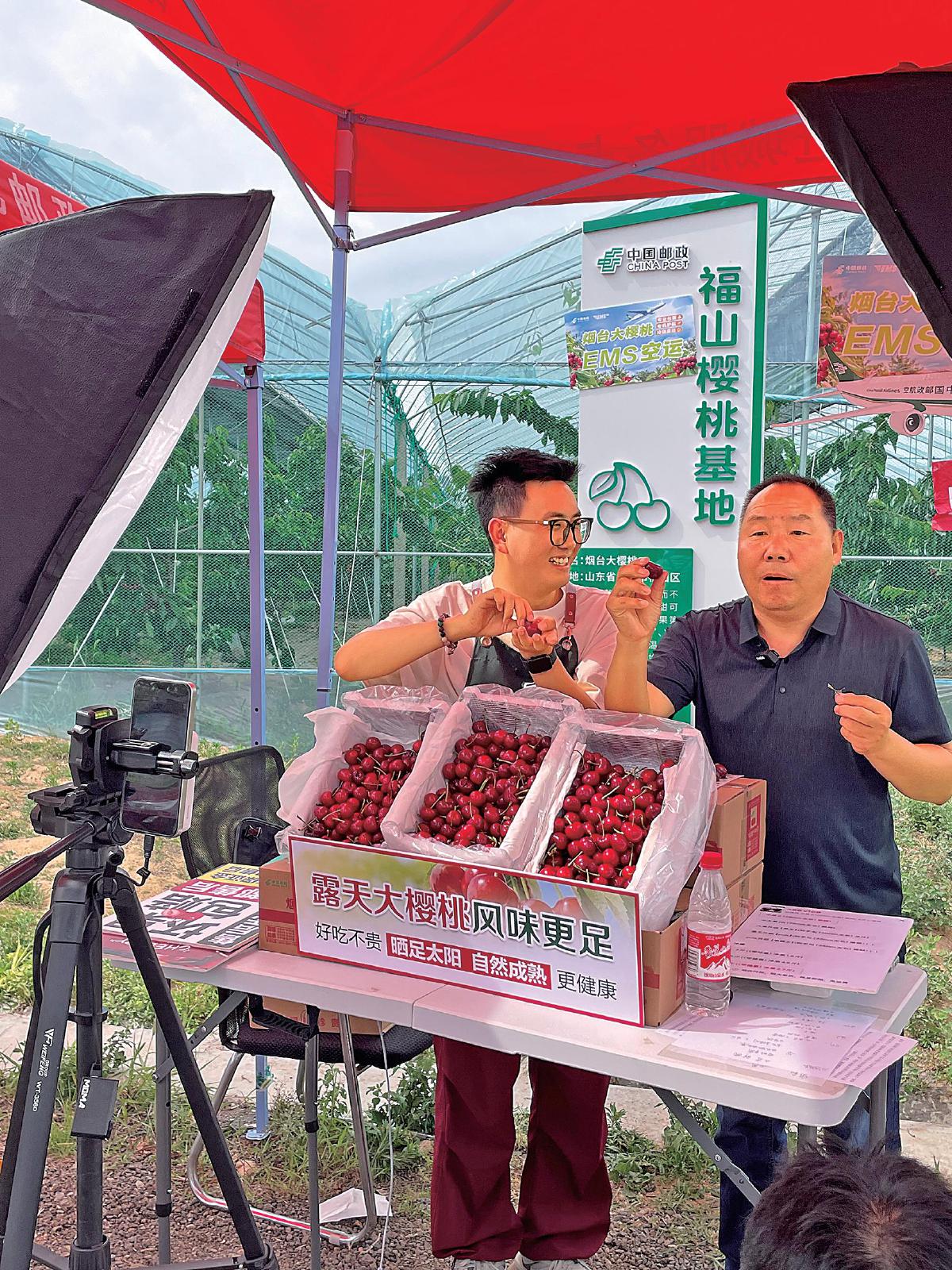 郵政員工與當(dāng)?shù)睾献魃缲?fù)責(zé)人在大櫻桃基地進(jìn)行現(xiàn)場(chǎng)直播。 □李雯婭 攝