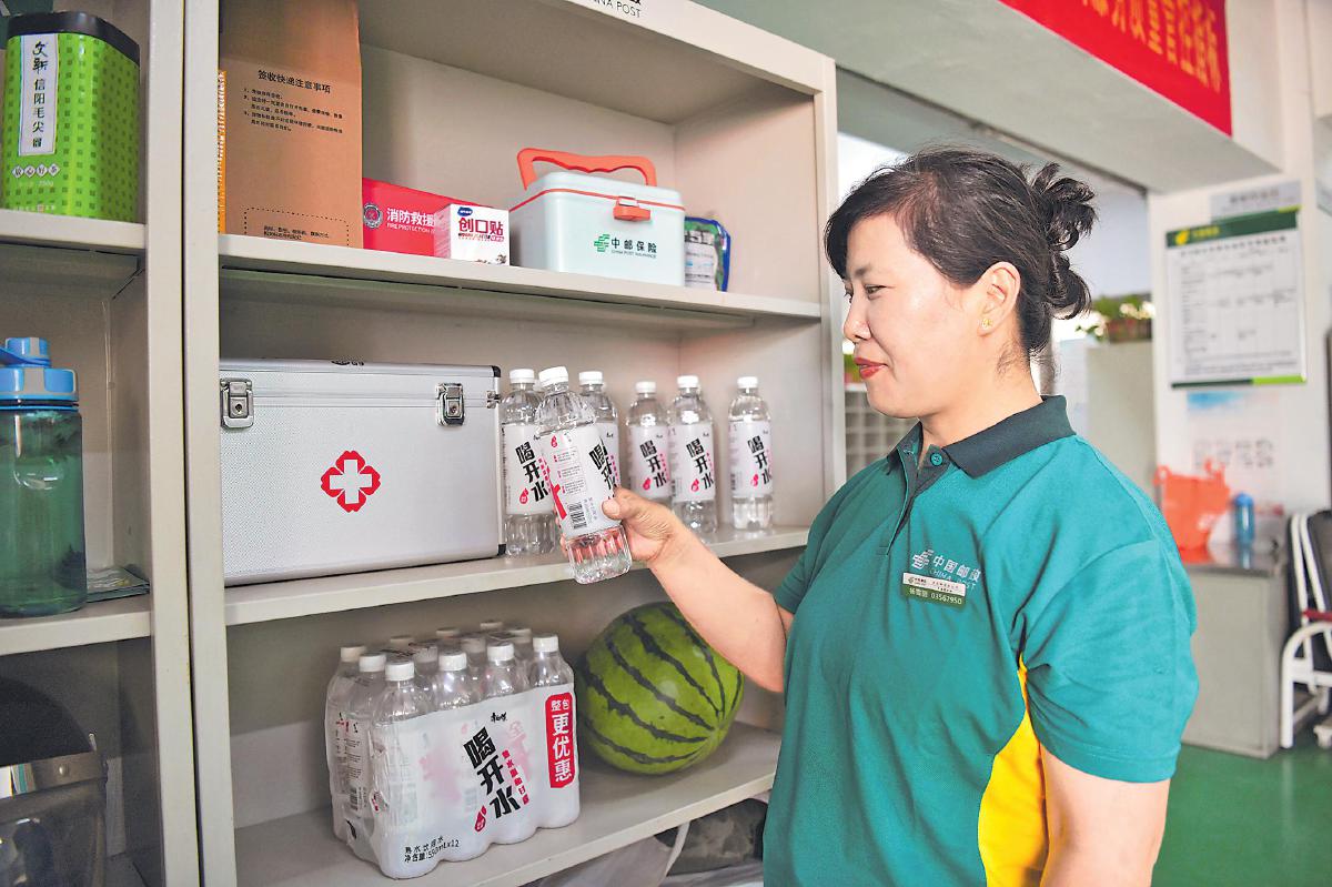 6月以來,河南省氣象臺連續(xù)發(fā)布多個高溫紅色預(yù)警。為應(yīng)對極端高溫天氣、保障企業(yè)安全穩(wěn)定運行,河南省郵政分公司要求所轄各級郵政企業(yè)加強對員工的關(guān)心關(guān)愛,做好一線生產(chǎn)人員的健康監(jiān)測,尤其是對攬投、分揀等一線生產(chǎn)人員,適當(dāng)調(diào)整作業(yè)時間,備齊防暑藥品及防暑飲品,聯(lián)合工會積極開展“夏日送清涼”等慰問活動,確保員工身體健康與生產(chǎn)安全。圖為鄭州市鄭東新區(qū)郵政分公司常寨攬投部為攬投員配備了防暑物品和藥品等。