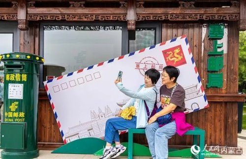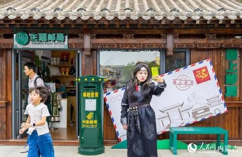 6月18日,來自廣東的游客在呼和浩特市玉泉區(qū)塞上老街旅游休閑街區(qū)“塞上主題郵局”前留影。
