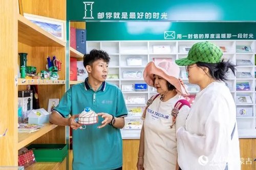 6月18日,工作人員在呼和浩特市玉泉區(qū)塞上老街旅游休閑街區(qū)“塞上主題郵局”內(nèi)向游客介紹特色文創(chuàng)產(chǎn)品。
