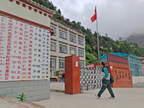 細(xì)雨連綿,道路濕滑。一路顛簸,提心吊膽,兩個(gè)小時(shí)后,郵車來到了德瑪龍村,藏式的建筑群整齊排列,五星紅旗懸掛在每戶大門上,沿街墻上張貼著“黨的光輝照邊疆 邊疆人民心向黨”等標(biāo)語。