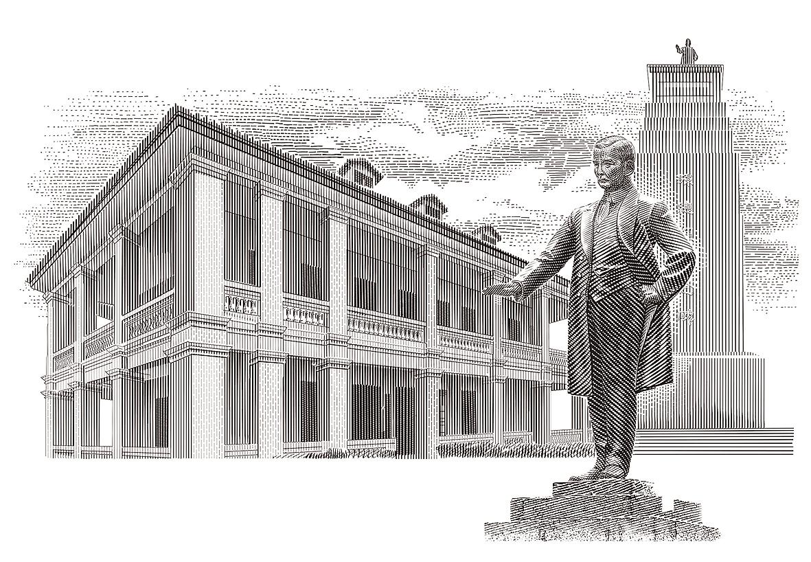 郵票二圖由徐喆和劉明慧兩位雕刻師共同創(chuàng)作。徐喆負(fù)責(zé)建筑部分,劉明慧負(fù)責(zé)雕像部分,于是同一枚郵票呈現(xiàn)出了兩種雕刻風(fēng)格,建筑的粗獷和人物的細(xì)膩,二者和諧統(tǒng)一、相得益彰。劉明慧對人物的刻畫非常準(zhǔn)確,能夠表現(xiàn)出原作的各種細(xì)微之處,特別是對人物面部表情的精準(zhǔn)把握,呈現(xiàn)出雕像特有的質(zhì)感和光影效果。選用紅色雕刻油墨印制,表達(dá)愛國精神,橘色的熒光使畫面更加溫暖、莊重。淡淡的米黃底色為郵票營造出一種復(fù)古的氛圍,既體現(xiàn)了年代感又與主題相得益彰,展現(xiàn)出黃埔軍校百年歷史的滄桑與厚重。