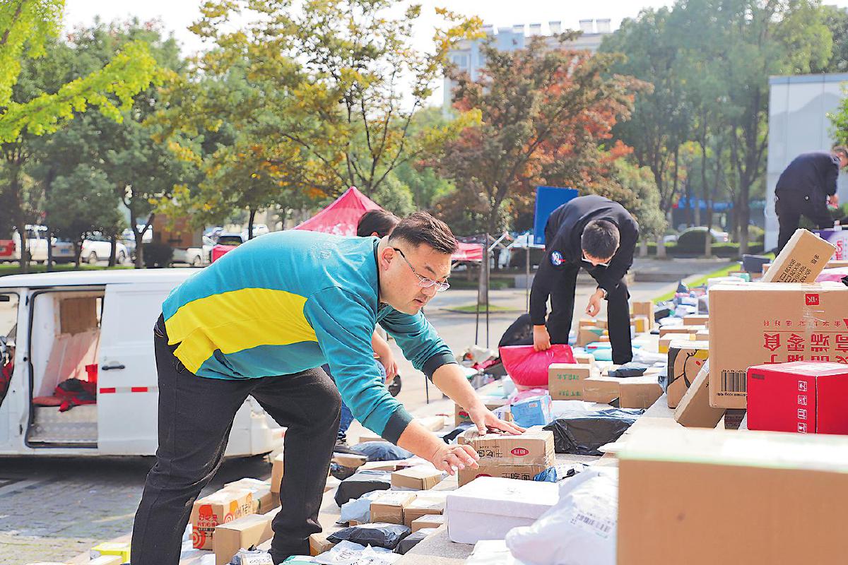 周江在整理即將投遞的郵件。