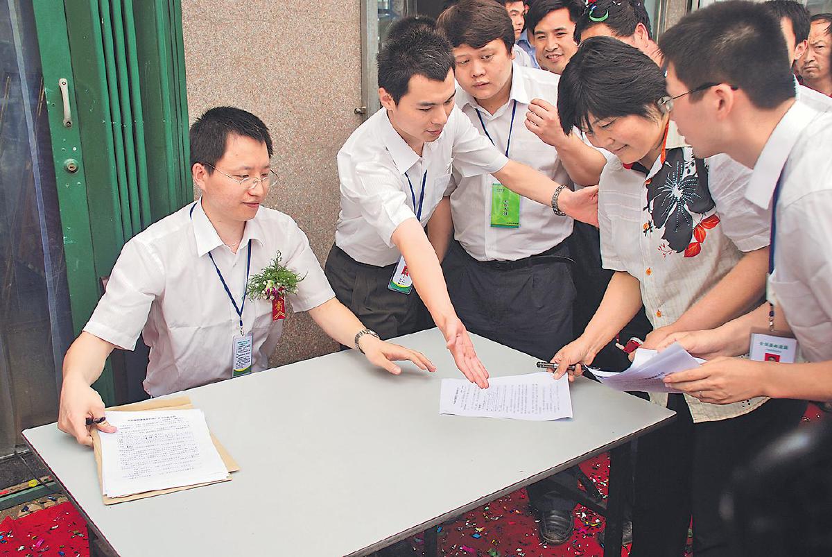 2007年6月22日,郵儲銀行第一位小額貸款客戶董景蓮(右二)辦理借款手續。