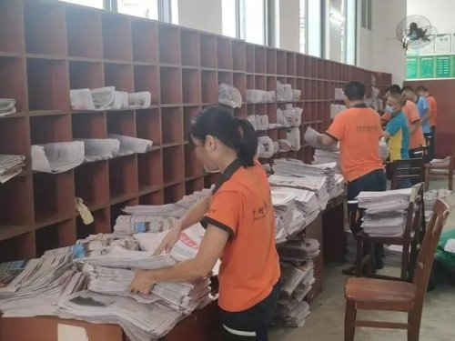 在澄邁縣郵政分公司郵件處理中心,分揀和投遞人員加班加點,集體投入臺風期間停運的報紙分發和投遞工作中,確保第一時間將報紙投遞上門,展現郵政速度。