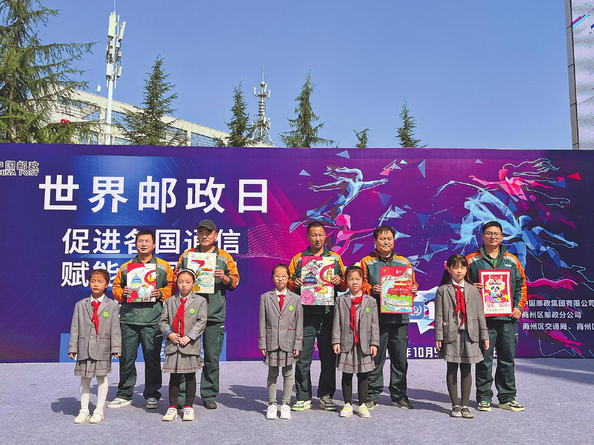 陜西省商洛市郵政分公司舉辦世界郵政日宣傳暨“童心同行 郵政相伴為美好生活加‘郵’”活動(dòng),來(lái)自商州區(qū)第六小學(xué)的5位小朋友現(xiàn)場(chǎng)為郵政快遞員送上了精美的手繪作品。 □張瀟 攝