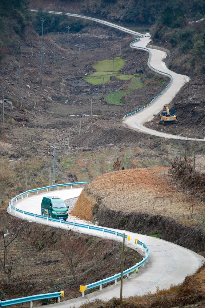 中國郵政貴州省龍里縣分公司的一輛小貨車在通往龍里縣平西村的山間道路上行駛(2023年2月14日攝)。新華社記者 劉續 攝