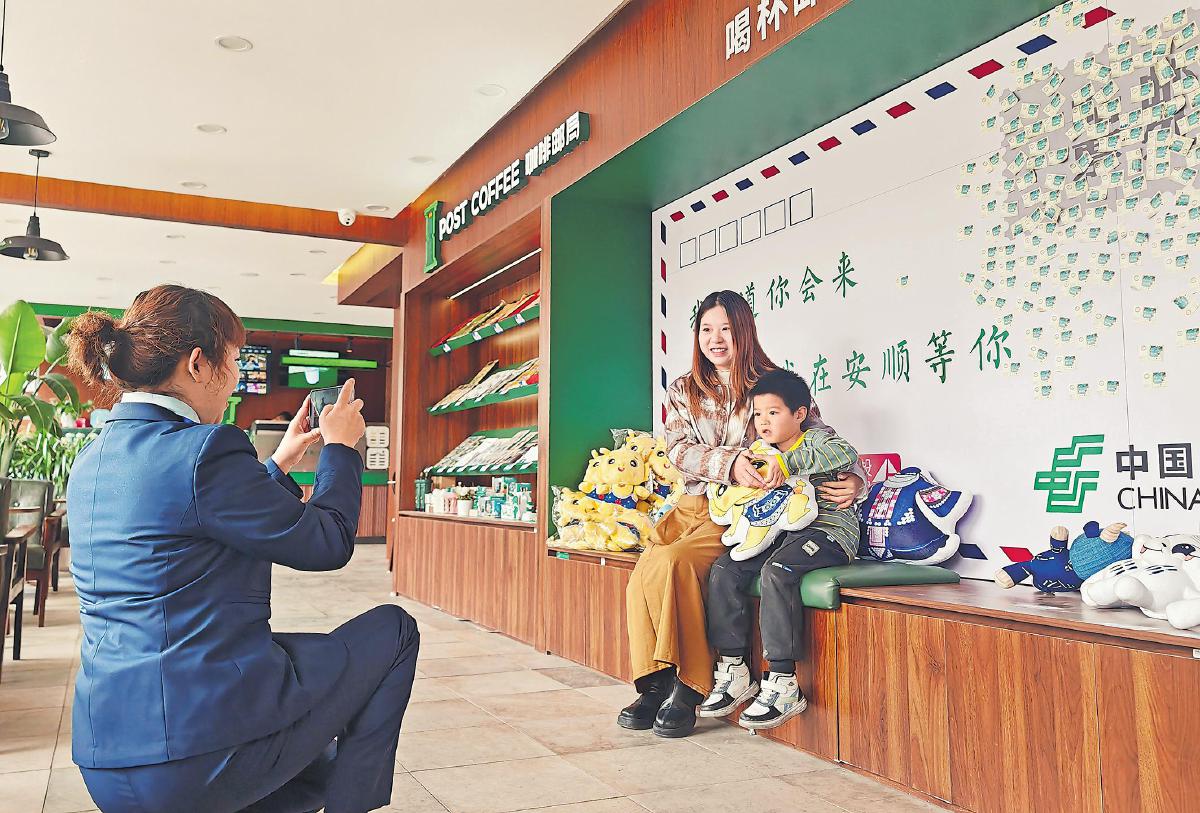 伴隨貴州省安順市打造城市旅游品牌的步伐,安順市郵政分公司深入推進(jìn)文旅融合,與安順旅游集團(tuán)文創(chuàng)商品發(fā)展有限公司攜手打造“郵局咖啡·遇見(jiàn)安旅店”。店內(nèi)裝修兼具郵政特色、古城風(fēng)格與現(xiàn)代風(fēng)情,設(shè)有文創(chuàng)展示、郵局文化、網(wǎng)紅打卡、印章加蓋及DIY明信片等區(qū)域,為游客提供獨(dú)特文化體驗(yàn),成為安順古城旅游的新地標(biāo)。圖為11月8日,郵政工作人員在為游客打卡拍照。