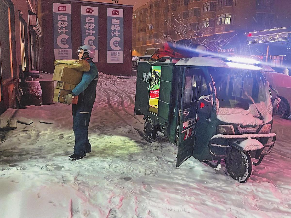 11月27日,黑龍江省雞西市突降大雪,路面被積雪覆蓋,車輛行駛困難。晚上8點多,雞東縣郵政分公司投遞員陳永廣冒著大雪來到石河北村投遞郵件。看到郵政人堅持第一時間投遞到戶,村民豎起了大拇指。