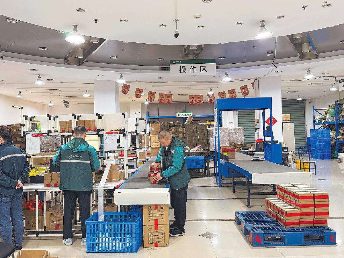 在上海郵政設立的互聯網醫院項目專項處理點,郵政工作人員正在封裝藥品郵件?! 蹶悤月贰z