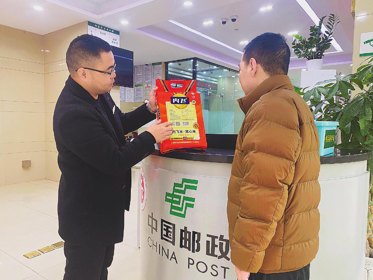 郵政工作人員為客戶介紹積分換購(gòu)產(chǎn)品——內(nèi)江大米。