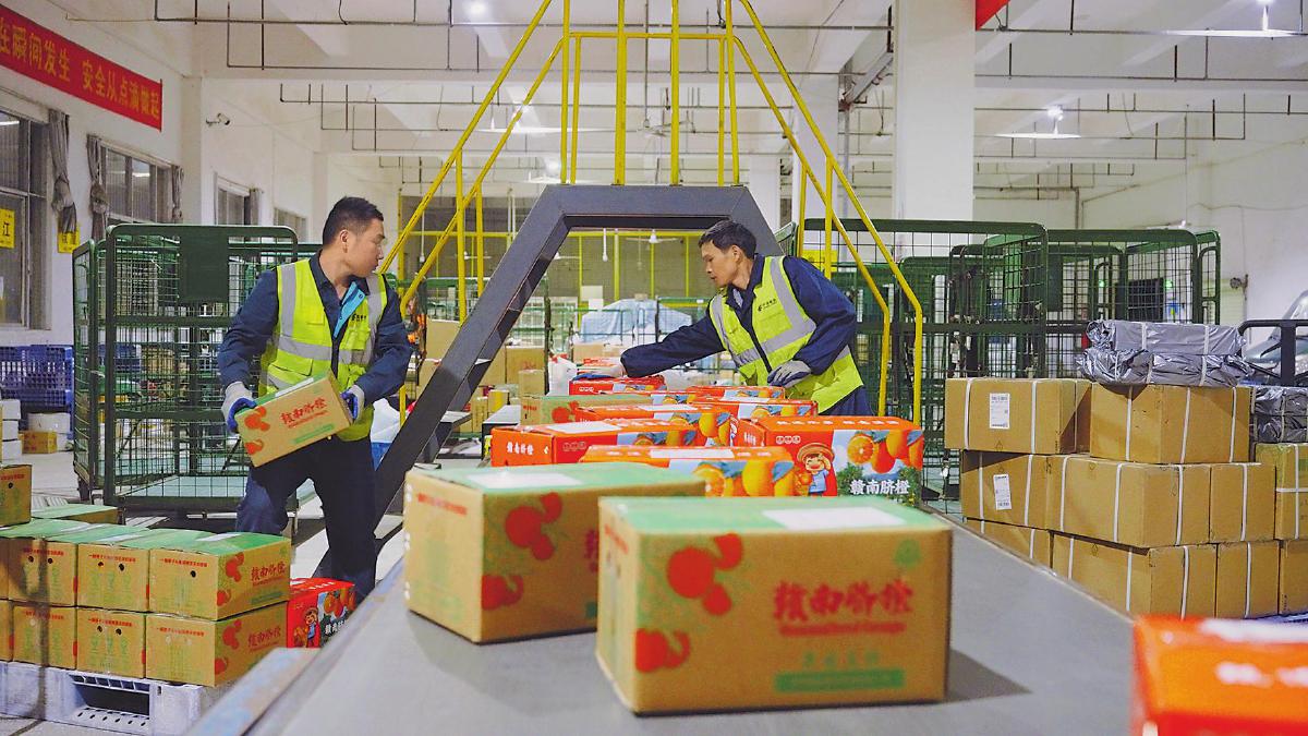 于都郵政寄遞物流共配中心迎來臍橙郵件處理高峰。□司小丁 攝