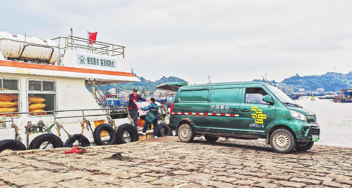截至12月20日,福建省寧德市郵政分公司已建成客貨郵融合中心鄉(xiāng)鎮(zhèn)站點(diǎn)81個(gè)、村級(jí)站點(diǎn)1059個(gè)、“交郵聯(lián)運(yùn)”線路25條,快遞進(jìn)村業(yè)務(wù)量達(dá)1651萬(wàn)件,比2023年增長(zhǎng)53%。在大力推進(jìn)客貨郵融合項(xiàng)目中,寧德郵政積極對(duì)接交通運(yùn)輸部門(mén),開(kāi)通全省首條“海上客貨郵融合線路”,推行水陸聯(lián)動(dòng)新模式,為海島居民和海上養(yǎng)殖戶(hù)提供貼心服務(wù)。圖為在霞浦縣下滸鎮(zhèn)外滸碼頭,郵政員工與客運(yùn)班船工作人員進(jìn)行郵件交接。