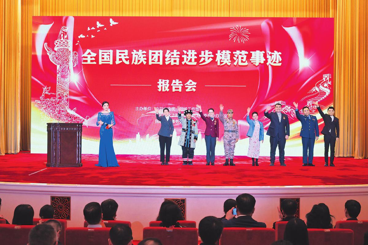 12月27日下午,由中央統戰部、黨和國家功勛榮譽表彰工作委員會辦公室、國家民委聯合舉辦的全國民族團結進步模范事跡報告會在北京人民大會堂舉行。包括桑南才在內的8名全國民族團結進步模范集體和模范個人代表聚焦學習貫徹全國民族團結進步表彰大會精神,生動講述圍繞鑄牢中華民族共同體意識主線團結奮進的感人故事。身著傈僳族盛裝的桑南才作為模范個人代表第一個登臺。