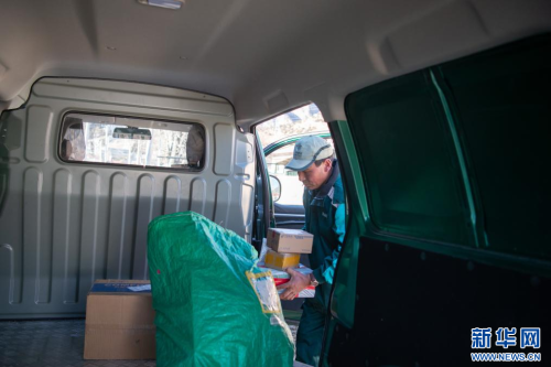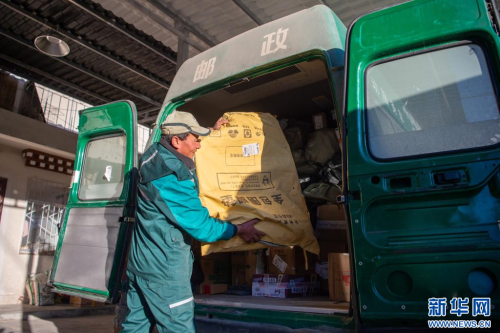 1月19日,在林芝鎮郵政所,郵遞員索朗次仁把準備派送的快遞裝車。