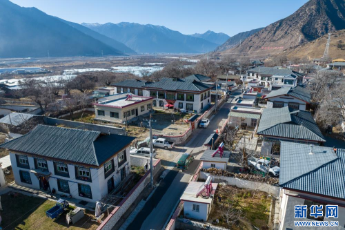 1月19日,西藏林芝市“郵快合作”新配備的郵遞車穿行在鄉村小巷(無人機照片)。