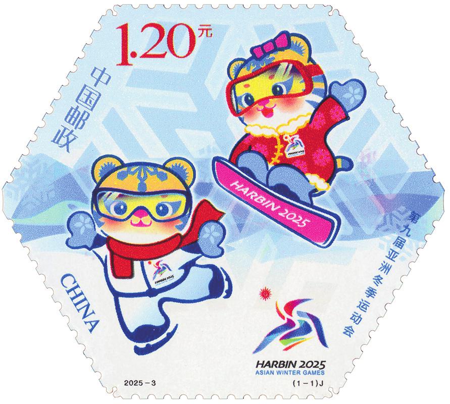 該套郵票采用六邊形票幅,以本屆亞冬會(huì)的吉祥物“濱濱”“妮妮”為畫面主體,輔之會(huì)徽及部分核心圖形加以表現(xiàn),畫面主題突出、構(gòu)圖簡約現(xiàn)代、色調(diào)純凈明快,充分展現(xiàn)出本屆亞冬會(huì)的鮮明特色。該套郵票采用高網(wǎng)線影寫版印刷工藝,以藍(lán)色為襯底基調(diào),配合特種珠光材料,增強(qiáng)背景視覺效果,豐富視覺層次。同時(shí),輔以雪花形異型齒孔和雪花色標(biāo),將工藝與主題融為一體,突出亞冬會(huì)舉辦地的冰雪美感。熒光油墨的運(yùn)用,在紫外燈光下,烘托出運(yùn)動(dòng)的激情與熱烈。